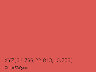 XYZ 34.788,22.813,10.753 Color is a normal red color and the nearest color is Jelly Bean #da614e. Hex code #dd5753 and RGB value is rgb(221,87,83). In RGB color space, this color is composed of 87% red, 34% green, 33% blue, In CMYK color space, this color is composed of 0% cyan, 61% magenta, 62% yellow , 13% black , In HSL color space, this color has a hue angle of 2° , 67% saturation and 60% lightness.