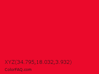 XYZ 34.795,18.032,3.932 Color is a normal red color and the nearest color is Medium Candy Apple Red #e2062c. Hex code #eb092b and RGB value is rgb(235,9,43). In RGB color space, this color is composed of 92% red, 4% green, 17% blue, In CMYK color space, this color is composed of 0% cyan, 96% magenta, 82% yellow , 8% black , In HSL color space, this color has a hue angle of 351° , 93% saturation and 48% lightness.