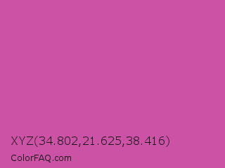 XYZ 34.802,21.625,38.416 Color is a normal magenta color and the nearest color is Pink Pantone #d74894. Hex code #cc52a6 and RGB value is rgb(204,82,166). In RGB color space, this color is composed of 80% red, 32% green, 65% blue, In CMYK color space, this color is composed of 0% cyan, 60% magenta, 19% yellow , 20% black , In HSL color space, this color has a hue angle of 319° , 54% saturation and 56% lightness.