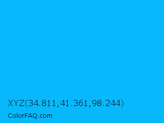 XYZ 34.811,41.361,98.244 Color is a normal blue color and the nearest color is Blue Bolt #00b9fb. Hex code #08b8fc and RGB value is rgb(8,184,252). In RGB color space, this color is composed of 3% red, 72% green, 99% blue, In CMYK color space, this color is composed of 97% cyan, 27% magenta, 0% yellow , 1% black , In HSL color space, this color has a hue angle of 197° , 98% saturation and 51% lightness.