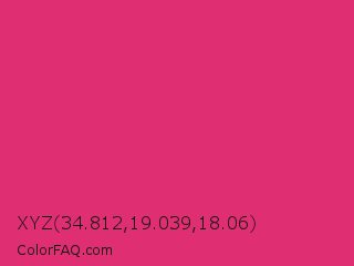 XYZ 34.812,19.039,18.06 Color is a normal rose color and the nearest color is Razzmatazz #e3256b. Hex code #e02e73 and RGB value is rgb(224,46,115). In RGB color space, this color is composed of 88% red, 18% green, 45% blue, In CMYK color space, this color is composed of 0% cyan, 79% magenta, 49% yellow , 12% black , In HSL color space, this color has a hue angle of 337° , 74% saturation and 53% lightness.