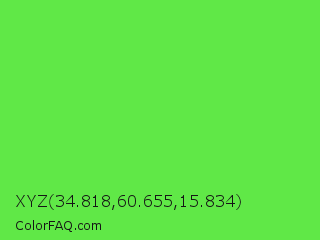 XYZ 34.818,60.655,15.834 Color is a normal green color and the nearest color is Screamin Green #66ff66. Hex code #60e847 and RGB value is rgb(96,232,71). In RGB color space, this color is composed of 38% red, 91% green, 28% blue, In CMYK color space, this color is composed of 59% cyan, 0% magenta, 69% yellow , 9% black , In HSL color space, this color has a hue angle of 111° , 78% saturation and 59% lightness.