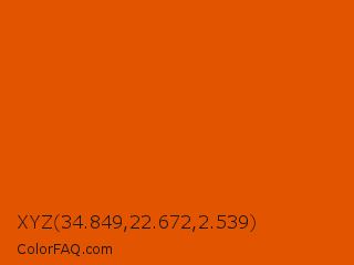 XYZ 34.849,22.672,2.539 Color is a normal orange color and the nearest color is Trinidad #e64e03. Hex code #e35400 and RGB value is rgb(227,84,0). In RGB color space, this color is composed of 89% red, 33% green, 0% blue, In CMYK color space, this color is composed of 0% cyan, 63% magenta, 100% yellow , 11% black , In HSL color space, this color has a hue angle of 22° , 100% saturation and 45% lightness.