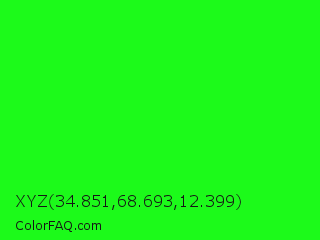 XYZ 34.851,68.693,12.399 Color is a normal green color and the nearest color is Neon Green #39ff14. Hex code #1cfa1a and RGB value is rgb(28,250,26). In RGB color space, this color is composed of 11% red, 98% green, 10% blue, In CMYK color space, this color is composed of 89% cyan, 0% magenta, 90% yellow , 2% black , In HSL color space, this color has a hue angle of 119° , 96% saturation and 54% lightness.