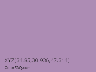 XYZ 34.85,30.936,47.314 Color is a light purple color and the nearest color is Glossy Grape #ab92b3. Hex code #ad8cb4 and RGB value is rgb(173,140,180). In RGB color space, this color is composed of 68% red, 55% green, 71% blue, In CMYK color space, this color is composed of 4% cyan, 22% magenta, 0% yellow , 29% black , In HSL color space, this color has a hue angle of 290° , 21% saturation and 63% lightness.