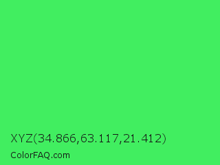 XYZ 34.866,63.117,21.412 Color is a normal green color and the nearest color is UFO Green #3cd070. Hex code #41ee60 and RGB value is rgb(65,238,96). In RGB color space, this color is composed of 25% red, 93% green, 38% blue, In CMYK color space, this color is composed of 73% cyan, 0% magenta, 60% yellow , 7% black , In HSL color space, this color has a hue angle of 131° , 84% saturation and 59% lightness.