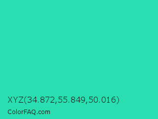XYZ 34.872,55.849,50.016 Color is a normal cyan color and the nearest color is Turquoise PWG #30d5c8. Hex code #29deb0 and RGB value is rgb(41,222,176). In RGB color space, this color is composed of 16% red, 87% green, 69% blue, In CMYK color space, this color is composed of 82% cyan, 0% magenta, 21% yellow , 13% black , In HSL color space, this color has a hue angle of 165° , 73% saturation and 52% lightness.