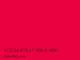 XYZ 34.879,17.906,6.468 Color is a normal rose color and the nearest color is Red Ribbon #ed0a3f. Hex code #ea0240 and RGB value is rgb(234,2,64). In RGB color space, this color is composed of 92% red, 1% green, 25% blue, In CMYK color space, this color is composed of 0% cyan, 99% magenta, 73% yellow , 8% black , In HSL color space, this color has a hue angle of 344° , 98% saturation and 46% lightness.