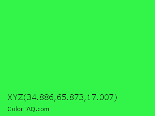 XYZ 34.886,65.873,17.007 Color is a normal green color and the nearest color is Lime Green #32cd32. Hex code #33f448 and RGB value is rgb(51,244,72). In RGB color space, this color is composed of 20% red, 96% green, 28% blue, In CMYK color space, this color is composed of 79% cyan, 0% magenta, 70% yellow , 4% black , In HSL color space, this color has a hue angle of 127° , 90% saturation and 58% lightness.