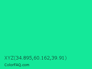 XYZ 34.895,60.162,39.91 Color is a normal green color and the nearest color is Medium Spring Green #00fa9a. Hex code #14e899 and RGB value is rgb(20,232,153). In RGB color space, this color is composed of 8% red, 91% green, 60% blue, In CMYK color space, this color is composed of 91% cyan, 0% magenta, 34% yellow , 9% black , In HSL color space, this color has a hue angle of 158° , 84% saturation and 49% lightness.