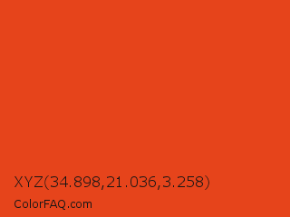 XYZ 34.898,21.036,3.258 Color is a normal red color and the nearest color is Pomegranate #f34723. Hex code #e6441b and RGB value is rgb(230,68,27). In RGB color space, this color is composed of 90% red, 27% green, 11% blue, In CMYK color space, this color is composed of 0% cyan, 70% magenta, 88% yellow , 10% black , In HSL color space, this color has a hue angle of 12° , 80% saturation and 50% lightness.