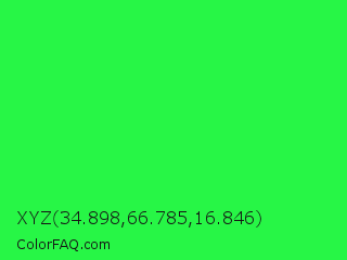 XYZ 34.898,66.785,16.846 Color is a normal green color and the nearest color is Malachite #0bda51. Hex code #27f646 and RGB value is rgb(39,246,70). In RGB color space, this color is composed of 15% red, 96% green, 27% blue, In CMYK color space, this color is composed of 84% cyan, 0% magenta, 72% yellow , 4% black , In HSL color space, this color has a hue angle of 129° , 92% saturation and 56% lightness.