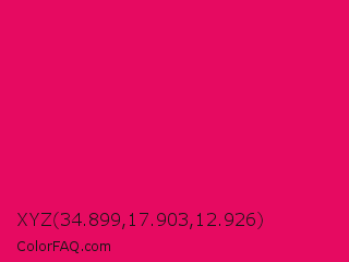 XYZ 34.899,17.903,12.926 Color is a normal rose color and the nearest color is Raspberry #e30b5d. Hex code #e60a61 and RGB value is rgb(230,10,97). In RGB color space, this color is composed of 90% red, 4% green, 38% blue, In CMYK color space, this color is composed of 0% cyan, 96% magenta, 58% yellow , 10% black , In HSL color space, this color has a hue angle of 336° , 92% saturation and 47% lightness.