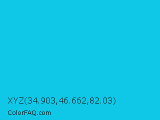 XYZ 34.903,46.662,82.03 Color is a normal cyan color and the nearest color is Cyan Process #00b7eb. Hex code #0fc7e6 and RGB value is rgb(15,199,230). In RGB color space, this color is composed of 6% red, 78% green, 90% blue, In CMYK color space, this color is composed of 93% cyan, 13% magenta, 0% yellow , 10% black , In HSL color space, this color has a hue angle of 189° , 88% saturation and 48% lightness.