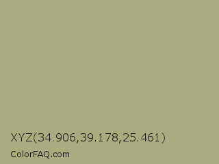 XYZ 34.906,39.178,25.461 Color is a normal yellow color and the nearest color is Hillary #aca586. Hex code #aaab7e and RGB value is rgb(170,171,126). In RGB color space, this color is composed of 67% red, 67% green, 49% blue, In CMYK color space, this color is composed of 1% cyan, 0% magenta, 26% yellow , 33% black , In HSL color space, this color has a hue angle of 61° , 21% saturation and 58% lightness.