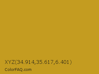 XYZ 34.914,35.617,6.401 Color is a normal orange color and the nearest color is Nugget #c59922. Hex code #c49c20 and RGB value is rgb(196,156,32). In RGB color space, this color is composed of 77% red, 61% green, 13% blue, In CMYK color space, this color is composed of 0% cyan, 20% magenta, 84% yellow , 23% black , In HSL color space, this color has a hue angle of 45° , 72% saturation and 45% lightness.