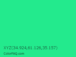 XYZ 34.924,61.126,35.157 Color is a normal green color and the nearest color is Shamrock #33cc99. Hex code #23ea8d and RGB value is rgb(35,234,141). In RGB color space, this color is composed of 14% red, 92% green, 55% blue, In CMYK color space, this color is composed of 85% cyan, 0% magenta, 40% yellow , 8% black , In HSL color space, this color has a hue angle of 152° , 83% saturation and 53% lightness.