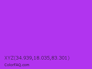 XYZ 34.939,18.035,83.301 Color is a normal purple color and the nearest color is Veronica #a020f0. Hex code #b134ef and RGB value is rgb(177,52,239). In RGB color space, this color is composed of 69% red, 20% green, 94% blue, In CMYK color space, this color is composed of 26% cyan, 78% magenta, 0% yellow , 6% black , In HSL color space, this color has a hue angle of 280° , 85% saturation and 57% lightness.