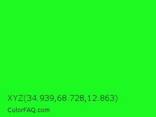 XYZ 34.939,68.728,12.863 Color is a normal green color and the nearest color is Neon Green #39ff14. Hex code #1cfa21 and RGB value is rgb(28,250,33). In RGB color space, this color is composed of 11% red, 98% green, 13% blue, In CMYK color space, this color is composed of 89% cyan, 0% magenta, 87% yellow , 2% black , In HSL color space, this color has a hue angle of 121° , 96% saturation and 55% lightness.