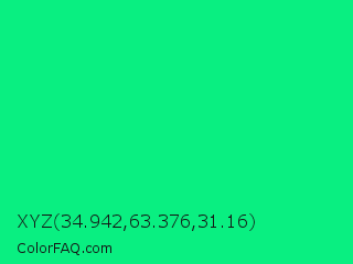 XYZ 34.942,63.376,31.16 Color is a normal green color and the nearest color is Spring Green #00ff7f. Hex code #09ef81 and RGB value is rgb(9,239,129). In RGB color space, this color is composed of 4% red, 94% green, 51% blue, In CMYK color space, this color is composed of 96% cyan, 0% magenta, 46% yellow , 6% black , In HSL color space, this color has a hue angle of 151° , 93% saturation and 49% lightness.