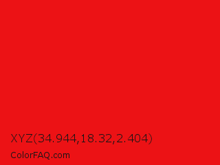 XYZ 34.944,18.32,2.404 Color is a normal red color and the nearest color is Vivid Red #f70d1a. Hex code #ec1215 and RGB value is rgb(236,18,21). In RGB color space, this color is composed of 93% red, 7% green, 8% blue, In CMYK color space, this color is composed of 0% cyan, 92% magenta, 91% yellow , 7% black , In HSL color space, this color has a hue angle of 359° , 86% saturation and 50% lightness.