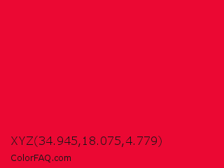 XYZ 34.945,18.075,4.779 Color is a normal red color and the nearest color is Medium Candy Apple Red #e2062c. Hex code #eb0833 and RGB value is rgb(235,8,51). In RGB color space, this color is composed of 92% red, 3% green, 20% blue, In CMYK color space, this color is composed of 0% cyan, 97% magenta, 78% yellow , 8% black , In HSL color space, this color has a hue angle of 349° , 93% saturation and 48% lightness.
