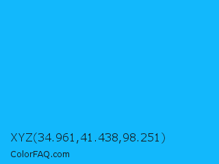 XYZ 34.961,41.438,98.251 Color is a normal blue color and the nearest color is Spiro Disco Ball #0fc0fc. Hex code #12b8fc and RGB value is rgb(18,184,252). In RGB color space, this color is composed of 7% red, 72% green, 99% blue, In CMYK color space, this color is composed of 93% cyan, 27% magenta, 0% yellow , 1% black , In HSL color space, this color has a hue angle of 197° , 98% saturation and 53% lightness.