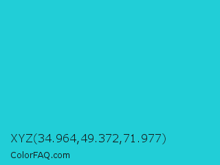 XYZ 34.964,49.372,71.977 Color is a normal cyan color and the nearest color is Scooter #2ebfd4. Hex code #21ced7 and RGB value is rgb(33,206,215). In RGB color space, this color is composed of 13% red, 81% green, 84% blue, In CMYK color space, this color is composed of 85% cyan, 4% magenta, 0% yellow , 16% black , In HSL color space, this color has a hue angle of 183° , 73% saturation and 49% lightness.