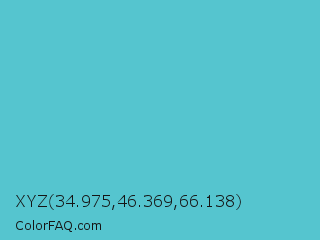 XYZ 34.975,46.369,66.138 Color is a normal cyan color and the nearest color is Sea Serpent #4bc7cf. Hex code #55c5cf and RGB value is rgb(85,197,207). In RGB color space, this color is composed of 33% red, 77% green, 81% blue, In CMYK color space, this color is composed of 59% cyan, 5% magenta, 0% yellow , 19% black , In HSL color space, this color has a hue angle of 185° , 56% saturation and 57% lightness.