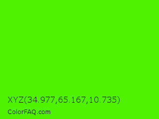 XYZ 34.977,65.167,10.735 Color is a normal green color and the nearest color is Chlorophyll Green #4aff00. Hex code #4ff200 and RGB value is rgb(79,242,0). In RGB color space, this color is composed of 31% red, 95% green, 0% blue, In CMYK color space, this color is composed of 67% cyan, 0% magenta, 100% yellow , 5% black , In HSL color space, this color has a hue angle of 100° , 100% saturation and 47% lightness.