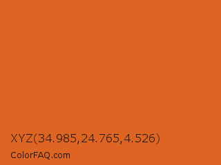 XYZ 34.985,24.765,4.526 Color is a normal orange color and the nearest color is Vivid Red Tangelo #df6124. Hex code #de6423 and RGB value is rgb(222,100,35). In RGB color space, this color is composed of 87% red, 39% green, 14% blue, In CMYK color space, this color is composed of 0% cyan, 55% magenta, 84% yellow , 13% black , In HSL color space, this color has a hue angle of 21° , 74% saturation and 50% lightness.