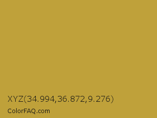 XYZ 34.994,36.872,9.276 Color is a normal yellow color and the nearest color is Satin Sheen Gold #cba135. Hex code #bfa13a and RGB value is rgb(191,161,58). In RGB color space, this color is composed of 75% red, 63% green, 23% blue, In CMYK color space, this color is composed of 0% cyan, 16% magenta, 70% yellow , 25% black , In HSL color space, this color has a hue angle of 46° , 53% saturation and 49% lightness.