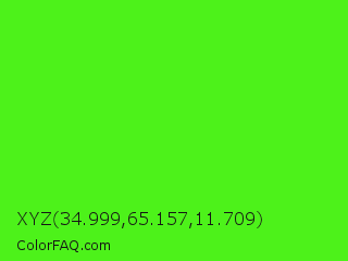 XYZ 34.999,65.157,11.709 Color is a normal green color and the nearest color is Neon Green #39ff14. Hex code #4df21a and RGB value is rgb(77,242,26). In RGB color space, this color is composed of 30% red, 95% green, 10% blue, In CMYK color space, this color is composed of 68% cyan, 0% magenta, 89% yellow , 5% black , In HSL color space, this color has a hue angle of 106° , 89% saturation and 53% lightness.