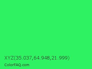 XYZ 35.037,64.948,21.999 Color is a normal green color and the nearest color is UFO Green #3cd070. Hex code #2ef261 and RGB value is rgb(46,242,97). In RGB color space, this color is composed of 18% red, 95% green, 38% blue, In CMYK color space, this color is composed of 81% cyan, 0% magenta, 60% yellow , 5% black , In HSL color space, this color has a hue angle of 136° , 88% saturation and 56% lightness.