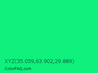 XYZ 35.059,63.902,29.889 Color is a normal green color and the nearest color is Spring Green #00ff7f. Hex code #0ff07d and RGB value is rgb(15,240,125). In RGB color space, this color is composed of 6% red, 94% green, 49% blue, In CMYK color space, this color is composed of 94% cyan, 0% magenta, 48% yellow , 6% black , In HSL color space, this color has a hue angle of 149° , 88% saturation and 50% lightness.