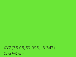 XYZ 35.05,59.995,13.347 Color is a normal green color and the nearest color is Kiwi #8ee53f. Hex code #6be637 and RGB value is rgb(107,230,55). In RGB color space, this color is composed of 42% red, 90% green, 22% blue, In CMYK color space, this color is composed of 53% cyan, 0% magenta, 76% yellow , 10% black , In HSL color space, this color has a hue angle of 102° , 78% saturation and 56% lightness.