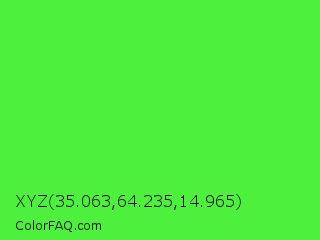 XYZ 35.063,64.235,14.965 Color is a normal green color and the nearest color is Lime Green #32cd32. Hex code #4df03d and RGB value is rgb(77,240,61). In RGB color space, this color is composed of 30% red, 94% green, 24% blue, In CMYK color space, this color is composed of 68% cyan, 0% magenta, 75% yellow , 6% black , In HSL color space, this color has a hue angle of 115° , 86% saturation and 59% lightness.