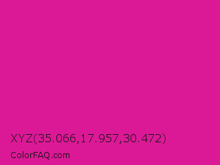 XYZ 35.066,17.957,30.472 Color is a normal magenta color and the nearest color is Barbie Pink #e0218a. Hex code #db1996 and RGB value is rgb(219,25,150). In RGB color space, this color is composed of 86% red, 10% green, 59% blue, In CMYK color space, this color is composed of 0% cyan, 89% magenta, 32% yellow , 14% black , In HSL color space, this color has a hue angle of 321° , 80% saturation and 48% lightness.