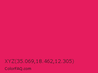 XYZ 35.069,18.462,12.305 Color is a normal rose color and the nearest color is Ruby #e0115f. Hex code #e61c5e and RGB value is rgb(230,28,94). In RGB color space, this color is composed of 90% red, 11% green, 37% blue, In CMYK color space, this color is composed of 0% cyan, 88% magenta, 59% yellow , 10% black , In HSL color space, this color has a hue angle of 340° , 80% saturation and 51% lightness.