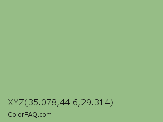 XYZ 35.078,44.6,29.314 Color is a light green color and the nearest color is Dark Sea Green #8fbc8f. Hex code #96bd86 and RGB value is rgb(150,189,134). In RGB color space, this color is composed of 59% red, 74% green, 53% blue, In CMYK color space, this color is composed of 21% cyan, 0% magenta, 29% yellow , 26% black , In HSL color space, this color has a hue angle of 103° , 29% saturation and 63% lightness.