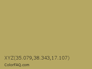 XYZ 35.079,38.343,17.107 Color is a normal yellow color and the nearest color is Husk #b7a458. Hex code #b5a762 and RGB value is rgb(181,167,98). In RGB color space, this color is composed of 71% red, 65% green, 38% blue, In CMYK color space, this color is composed of 0% cyan, 8% magenta, 46% yellow , 29% black , In HSL color space, this color has a hue angle of 50° , 36% saturation and 55% lightness.