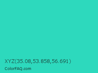 XYZ 35.08,53.858,56.691 Color is a normal cyan color and the nearest color is Turquoise PWG #30d5c8. Hex code #2dd9bd and RGB value is rgb(45,217,189). In RGB color space, this color is composed of 18% red, 85% green, 74% blue, In CMYK color space, this color is composed of 79% cyan, 0% magenta, 13% yellow , 15% black , In HSL color space, this color has a hue angle of 170° , 69% saturation and 51% lightness.