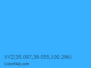 XYZ 35.097,39.055,100.296 Color is a light blue color and the nearest color is Brilliant Azure #3399ff. Hex code #36b0ff and RGB value is rgb(54,176,255). In RGB color space, this color is composed of 21% red, 69% green, 100% blue, In CMYK color space, this color is composed of 79% cyan, 31% magenta, 0% yellow , 0% black , In HSL color space, this color has a hue angle of 204° , 100% saturation and 61% lightness.