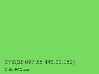 XYZ 35.097,55.448,20.162 Color is a light green color and the nearest color is Pastel Green #77dd77. Hex code #77db61 and RGB value is rgb(119,219,97). In RGB color space, this color is composed of 47% red, 86% green, 38% blue, In CMYK color space, this color is composed of 46% cyan, 0% magenta, 56% yellow , 14% black , In HSL color space, this color has a hue angle of 109° , 63% saturation and 62% lightness.