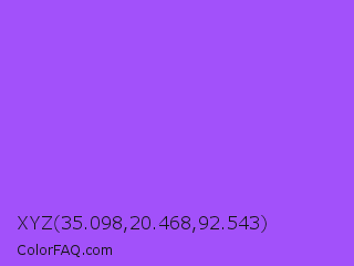 XYZ 35.098,20.468,92.543 Color is a light violet color and the nearest color is Navy Purple #9457eb. Hex code #a251fa and RGB value is rgb(162,81,250). In RGB color space, this color is composed of 64% red, 32% green, 98% blue, In CMYK color space, this color is composed of 35% cyan, 68% magenta, 0% yellow , 2% black , In HSL color space, this color has a hue angle of 269° , 94% saturation and 65% lightness.