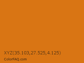 XYZ 35.103,27.525,4.125 Color is a normal orange color and the nearest color is Meteor #d07d12. Hex code #d97514 and RGB value is rgb(217,117,20). In RGB color space, this color is composed of 85% red, 46% green, 8% blue, In CMYK color space, this color is composed of 0% cyan, 46% magenta, 91% yellow , 15% black , In HSL color space, this color has a hue angle of 30° , 83% saturation and 46% lightness.