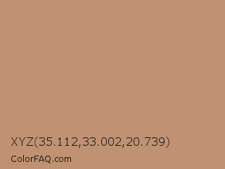 XYZ 35.112,33.002,20.739 Color is a normal orange color and the nearest color is Desert Camel #c19a6b. Hex code #c09273 and RGB value is rgb(192,146,115). In RGB color space, this color is composed of 75% red, 57% green, 45% blue, In CMYK color space, this color is composed of 0% cyan, 24% magenta, 40% yellow , 25% black , In HSL color space, this color has a hue angle of 24° , 38% saturation and 60% lightness.