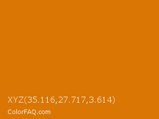 XYZ 35.116,27.717,3.614 Color is a normal orange color and the nearest color is Mango Tango Crayola #e77200. Hex code #d97604 and RGB value is rgb(217,118,4). In RGB color space, this color is composed of 85% red, 46% green, 2% blue, In CMYK color space, this color is composed of 0% cyan, 46% magenta, 98% yellow , 15% black , In HSL color space, this color has a hue angle of 32° , 96% saturation and 43% lightness.
