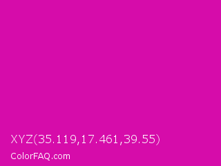 XYZ 35.119,17.461,39.55 Color is a normal magenta color and the nearest color is Hollywood Cerise #f400a1. Hex code #d60caa and RGB value is rgb(214,12,170). In RGB color space, this color is composed of 84% red, 5% green, 67% blue, In CMYK color space, this color is composed of 0% cyan, 94% magenta, 21% yellow , 16% black , In HSL color space, this color has a hue angle of 313° , 89% saturation and 44% lightness.