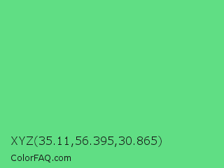 XYZ 35.11,56.395,30.865 Color is a light green color and the nearest color is Very Light Malachite Green #64e986. Hex code #60de84 and RGB value is rgb(96,222,132). In RGB color space, this color is composed of 38% red, 87% green, 52% blue, In CMYK color space, this color is composed of 57% cyan, 0% magenta, 41% yellow , 13% black , In HSL color space, this color has a hue angle of 137° , 66% saturation and 62% lightness.